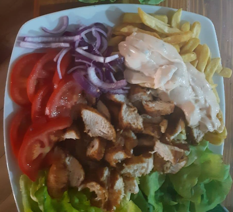 pui, cartofi pai, castraveți murați, ceapă, varză, roșii, sos